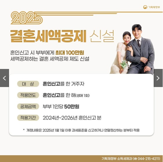 이 공제는 2024년부터 2026년까지 혼인신고를 한 경우에 한해 적용되며, 2025년 1월 1일 이후 과세표준 신고 또는 연말정산 시부터 적용됩니다.