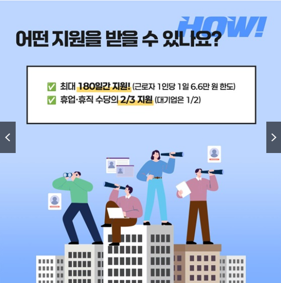 - 지원 비율: 휴업 또는 휴직 수당의 3분의 2를 지원하며, 대기업의 경우 2분의 1을 지원합니다.