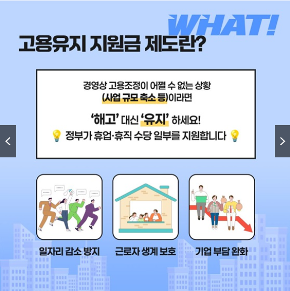 고용유지 지원금은 경영상의 이유로 불가피하게 고용 조정이 필요한 상황에서 기업이 근로자를 해고하지 않고 휴업 또는 휴직 등의 고용유지 조치를 취할 경우, 정부가 해당 기업에 대해 휴업·휴직 수당의 일부를 지원하는 제도입니다. 이를 통해 일자리 감소를 방지하고, 근로자의 생계를 보호하며, 기업의 부담을 완화하는 것을 목표로 합니다.