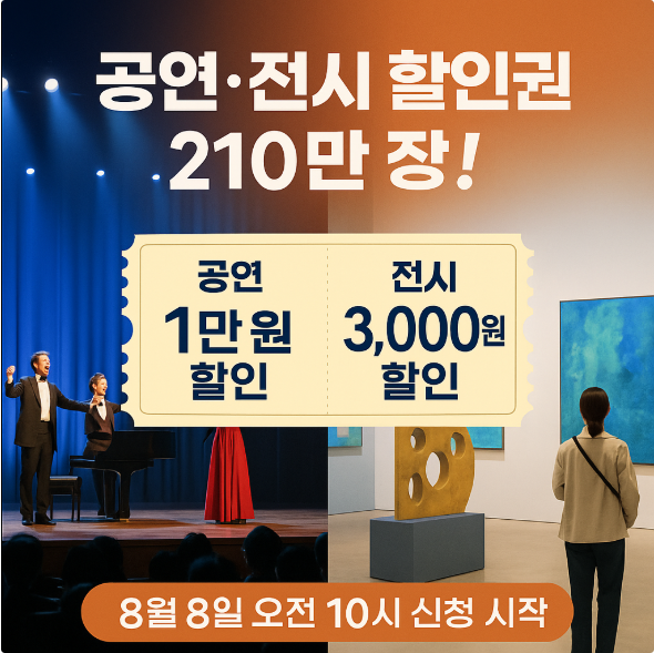 “문화체육관광부, 예술경영지원센터, 한국문화예술위원회가 2025년 2차 추가경정예산 100억 원을 활용해 2025년 8월 8일부터 공연 50만 장, 전시 160만 장을 포함한 총 210만 장의 할인권을 선착순으로 배포합니다. 온라인 예매처 5곳에서 1인당 최대 2매까지 신청 가능하며, 공연은 1만 원, 전시는 3,000원의 할인 혜택이 주어집니다. 사용 기한과 대상, 신청 방법, 온라인 취약계층 대상 안내까지 꼼꼼히 확인해 실질적인 문화 향유 기회를 넓히세요.”