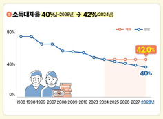 소득대체율이란 은퇴 전 평균 소득 대비 연금으로 받는 금액의 비율을 의미한다. 기존에는 2028년까지 소득대체율을 40%로 낮추는 것이 계획되어 있었으나, 이번 개혁을 통해 42% 수준에서 유지하는 방향으로 변경되었다.