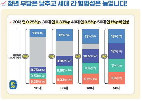 이번 개편은 국민 부담을 최소화하기 위해 단계적으로 이루어질 예정이다. 세대별 보험료율 인상 속도를 달리 적용하여 50대 가입자는 연 1%p씩, 40대는 0.5%p, 30대는 0.33%p, 20대는 0.25%p씩 인상하게 된다. 이렇게 하면 청년층이 연금 개혁에 대한 부담을 덜 느끼면서도 장기적으로 연금 재정이 안정될 수 있다.