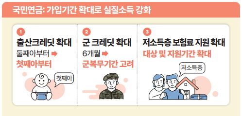출산·군복무 크레딧 강화: 첫째아부터 출산 크레딧 인정, 군 복무 크레딧 인정 기간 확대