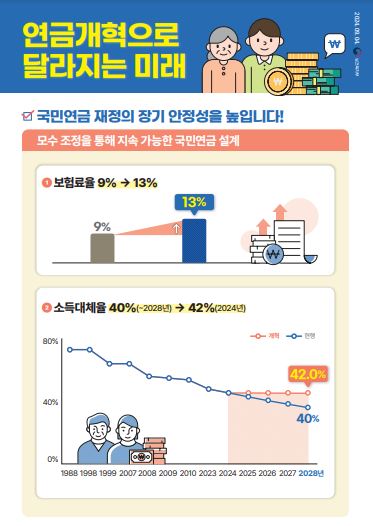 정부가 국민연금의 장기적인 지속가능성을 확보하기 위해 보험료율을 9%에서 13%로 인상하고, 소득대체율을 42%로 상향 조정하는 방안을 발표했다. 이는 국민연금 재정을 안정화하고 세대 간 형평성을 높이며, 노후소득 보장을 강화하기 위한 개혁의 일환이다. 이번 글에서는 국민연금 개혁의 주요 내용과 그에 따른 영향을 살펴보겠다.