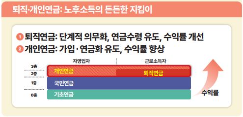 퇴직연금 도입도 의무화하여 노후소득원을 다층적으로 확보하고, 가입률이 낮은 영세 사업장의 가입을 유도하는 인센티브도 제공된다. 퇴직연금 수익률을 높이기 위해 디폴트옵션을 개선하고, 금융기관 간 경쟁을 촉진하는 방안도 추진된다.