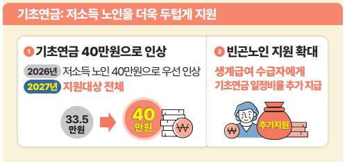 기초연금 수급자를 위한 지원도 확대된다. 현재 30만 원인 기초연금액을 2026년부터 40만 원으로 인상하며, 생계급여를 받는 어르신들에게는 기초연금 삭감이 최소화되도록 개선할 예정이다.