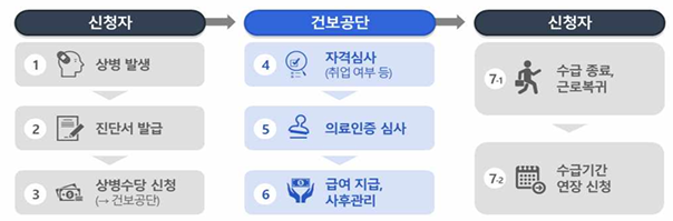 - 업무상 질병이나 산재사고는 산재보험 대상이므로 상병수당 신청 불가