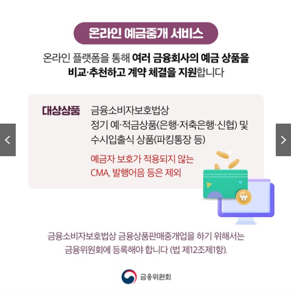 기존에는 정기 예·적금 상품에 한해 중개가 가능했으나, 이번 정식 도입을 통해 수시입출식 상품(파킹통장 등)까지 확대 적용됩니다. 반면, 예금자 보호 대상이 아닌 CMA, 발행어음 등은 여전히 중개 대상에서 제외됩니다.