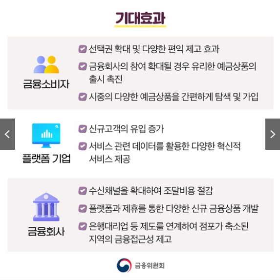 정식 도입된 온라인 예금중개 서비스는 금융소비자, 플랫폼 기업, 금융회사 등 이해관계자 모두에게 긍정적인 파급효과를 가져올 것으로 보입니다.