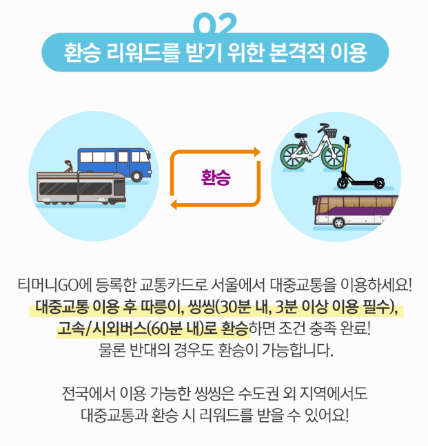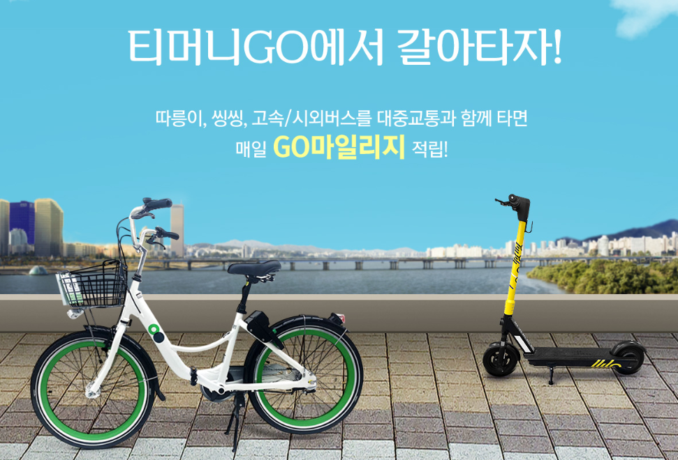 - 공공자전거 연동: 서울시 공공자전거 '따릉이'와 대전시 공공자전거 '타슈'를 티머니GO에서 간편하게 이용할 수 있습니다.
