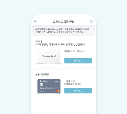 - 교통카드의 번호를 입력하거나 NFC 기능을 활용하여 카드를 등록합니다.