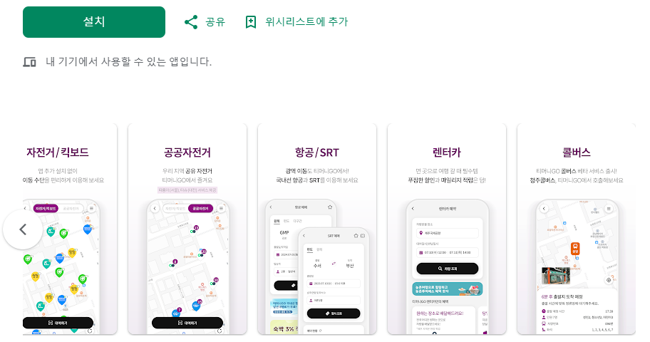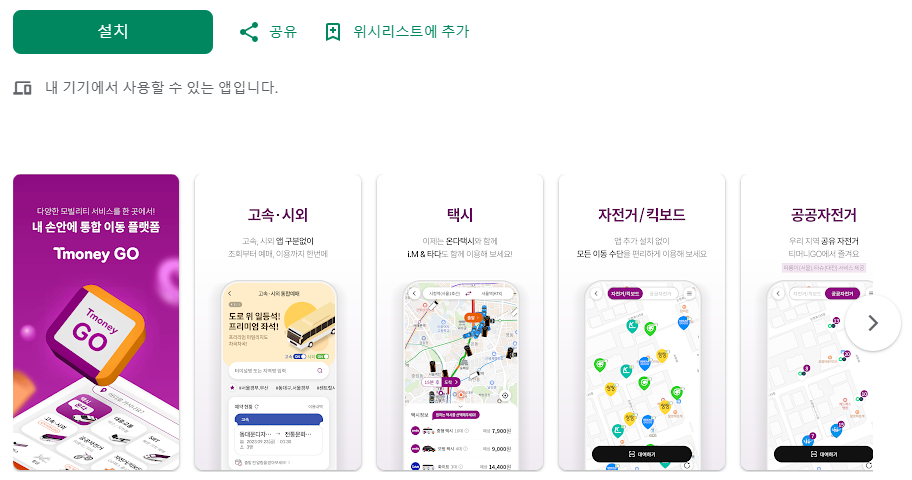 - 검색 결과에서 티머니GO 앱을 선택하고 '설치' 버튼을 눌러 다운로드 및 설치를 진행합니다.