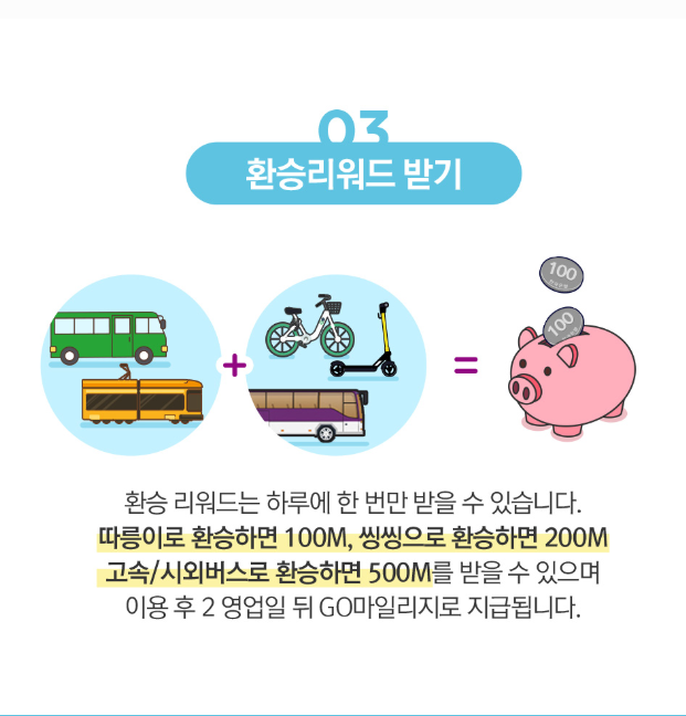 - 등록된 교통카드를 통해 버스, 지하철 등 대중교통을 이용하면 마일리지가 자동으로 적립됩니다.
