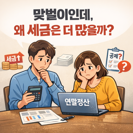 맞벌이 부부에게 절세는 선택이 아니라 관리의 영역이다. 조금만 시각을 바꾸고 준비 과정을 앞당기면, 같은 소득에서도 훨씬 효율적인 결과를 만들 수 있다. 올해 연말정산을 앞두고 있다면, 이제는 ‘각자’가 아니라 ‘함께’ 절세 전략을 세워보자.