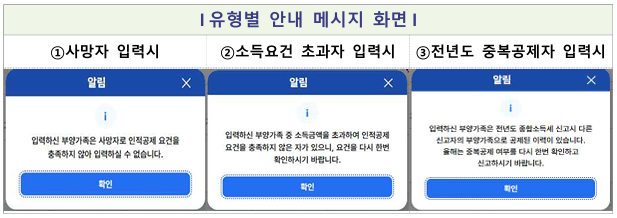 올해부터는 인적공제 대상의 적정성 확인을 위한 **'자동 검증 시스템'**이 도입되었습니다. 인적공제 요건을 충족하지 않는 부양가족을 잘못 입력해 과다 공제를 받는 것을 방지하기 위해, 사망자, 소득 초과자, 중복공제 가능성이 있는 인원 등을 입력할 경우 경고 메시지와 재확인 안내가 제공됩니다.