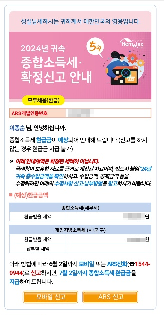 해당 안내문을 받은 납세자는 ARS 전화(☎1544-9944) 한 통으로 간단히 신고할 수 있으며, 홈택스나 손택스 접속 없이도 자동화된 방식으로 신고가 완료됩니다. 공제항목 변경 등 추가 조정이 필요한 경우에는 홈택스·손택스를 통해 수정신고가 가능합니다.