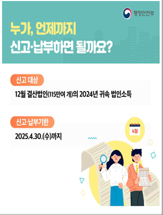 2025년에는 12월 결산법인 약 115만 개가 해당되며, 이들 법인은 2024년 귀속분 소득에 대한 법인지방소득세를 4월 30일까지 반드시 신고하고 납부해야 합니다.