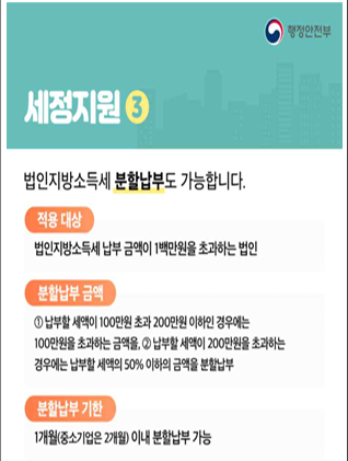 법인지방소득세는 일시 납부에 부담이 되는 경우 분할납부 제도를 통해 유예할 수 있습니다.