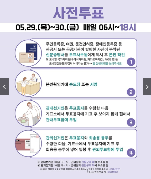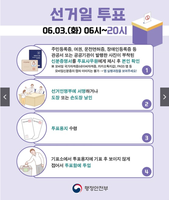 - 신분증 제시 및 본인 확인: 사전투표와 동일하게, 유효한 신분증을 제시하여 본인 확인을 받습니다.