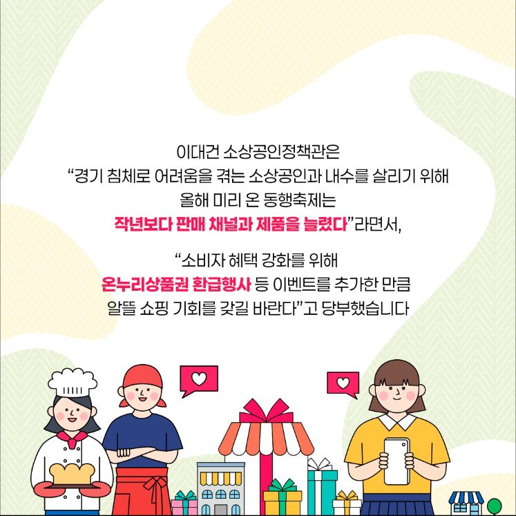 - 소비자 혜택 강화온누리상품권 환급, 할인 쿠폰, 추첨 이벤트 등 소비자 혜택을 강화하여 합리적인 소비가 가능합니다.