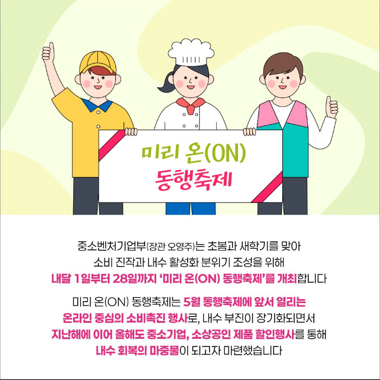 ‘미리 온(ON) 동행축제’는 중소기업 및 소상공인의 매출 증진과 판매 촉진을 목적으로 중소벤처기업부에서 주관하는 대규모 소비촉진 캠페인입니다. 특히, 내수 부진이 장기화되면서 지난해에 이어 올해에도 내수 회복의 마중물 역할을 하기를 기대하며 마련된 행사입니다.