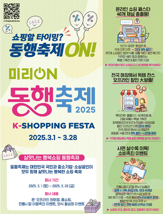 다가오는 3월, 중소벤처기업부가 주관하는 ‘미리 온(ON) 동행축제’가 개최됩니다. 초봄과 새학기를 맞이하여 소비를 촉진하고 내수 활성화를 도모하기 위한 이 행사는 중소기업 및 소상공인의 제품을 보다 저렴한 가격에 만날 수 있는 좋은 기회입니다. 특히 이번 행사에서는 온라인과 오프라인을 아우르는 다양한 유통채널을 통해 최대 30%까지 할인이 제공될 예정입니다.