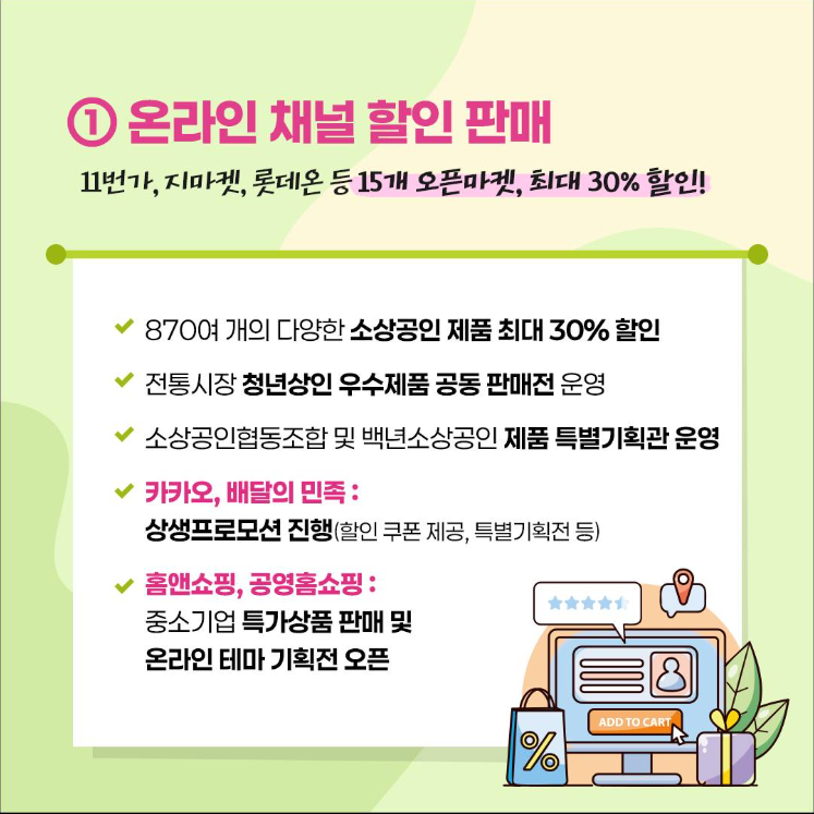 - 라이브커머스 할인: SK스토아, 그립, 오아시스 등에서 우수 소상공인 제품 최대 30% 할인 판매