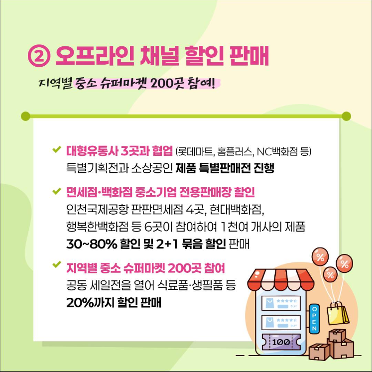 - 오프라인: 전통시장, 골목식당, 대형유통사 특별판매전 등에서 제품을 구매하며 혜택을 누릴 수 있습니다.