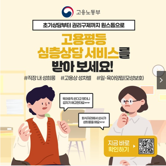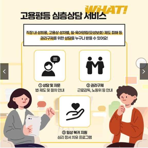 직장 내 성희롱, 고용상 성차별, 일·육아 양립(모성보호) 제도 피해 등으로 어려움을 겪는 근로자들을 위한 '고용평등 심층상담 서비스'가 제공되고 있습니다. 이 서비스는 초기 상담부터 권리 구제, 심리 정서 치유까지 원스톱으로 지원하여 근로자들이 평등하고 안전한 근무 환경을 조성하는 데 도움을 줍니다. 이번 포스팅에서는 고용평등 심층상담 서비스의 주요 내용과 이용 방법에 대해 자세히 알아보겠습니다.