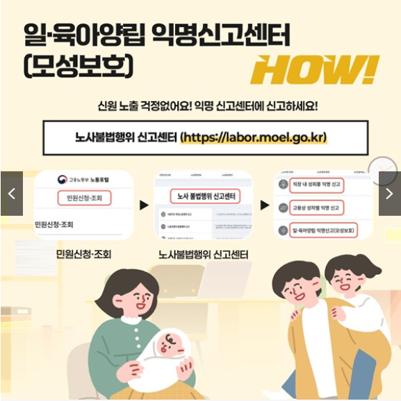 일과 육아를 병행하는 과정에서 모성보호 관련 제도에 대한 부당한 대우나 차별을 겪는 경우, 신원 노출에 대한 우려로 신고를 망설일 수 있습니다. 이를 해결하기 위해 고용노동부는 '일·육아양립 익명신고센터'를 운영하고 있습니다.