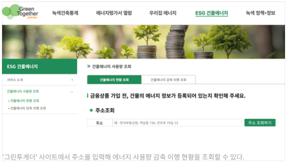 가입을 희망하는 고객은 SC제일은행 모바일 앱을 통해 신청할 수 있습니다. 자신의 거주지 전기 사용량은 녹색건축포털 '그린투게더' 웹사이트에서 확인할 수 있으며, 주소를 입력하면 에너지 사용량과 절감 현황을 조회할 수 있습니다. 녹색건축포털 그린투게더