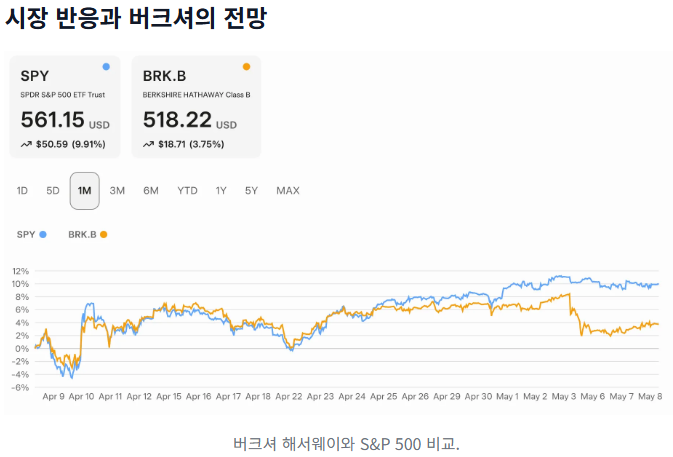 버핏의 은퇴 발표 후, 버크셔 해서웨이의 주가는 일시적으로 하락했지만, 장기적인 전망은 긍정적으로 평가되고 있습니다. 버크셔는 발표 전까지 S&P 500을 상회하는 수익률을 기록했으며, A주(BRK.A)는 사상 최고가를 경신했습니다.