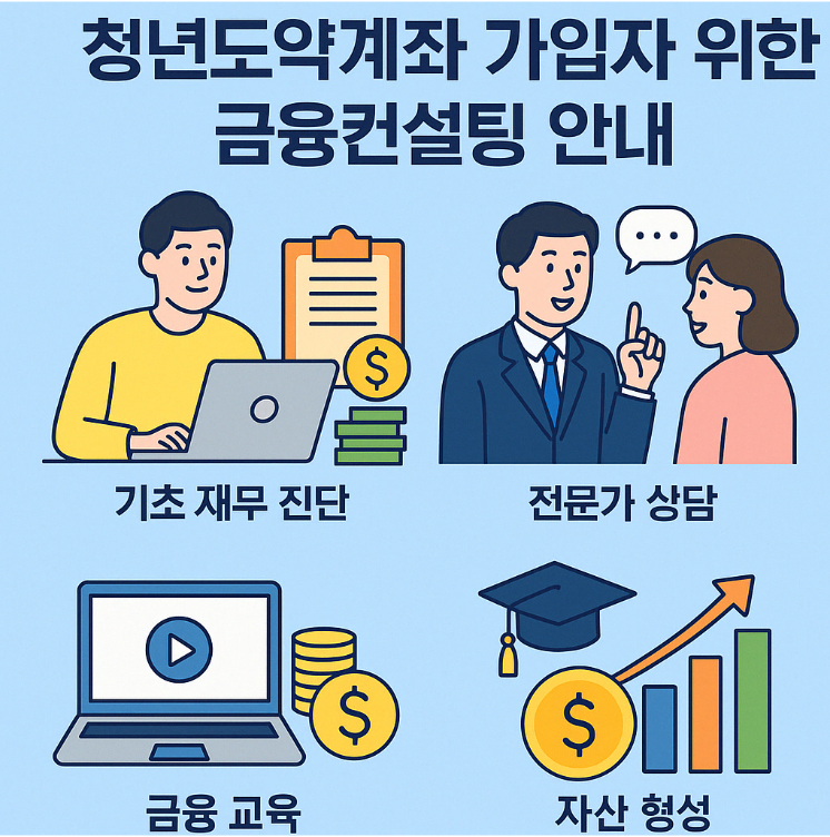 청년들의 재무 설계를 돕기 위해 서민금융진흥원은 '원스톱 청년금융 컨설팅센터'를 운영하고 있습니다. 이 센터는 청년도약계좌 가입자를 대상으로 기초 재무 진단부터 전문가 상담, 금융 교육까지 종합적인 서비스를 제공합니다. 청년들이 자산 형성에 필요한 정보를 얻고, 재무 계획을 세울 수 있도록 지원하는 이 컨설팅 프로그램은 2024년 12월부터 운영 중입니다.