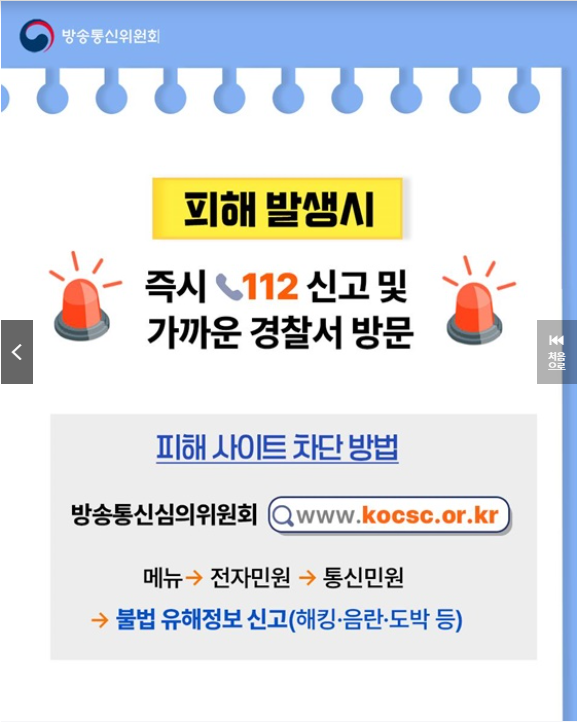 - 피해 사이트는 방송통신심의위원회 홈페이지에서 아래 절차로 신고 가능 방송통신심의위원회