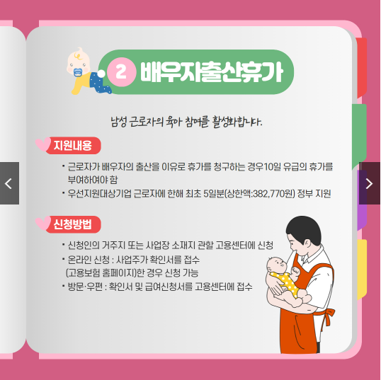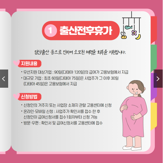 - 휴가 기간: 총 90일 (다태아의 경우 120일)
