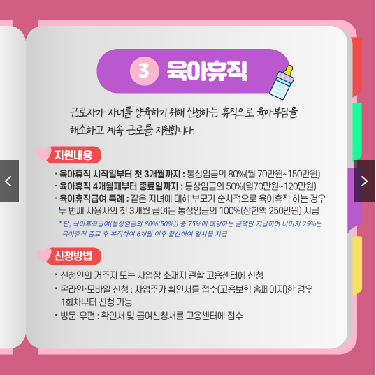 - 생후 12개월 이내 자녀에 대해 부모가 모두 육아휴직을 사용하는 경우, 각각의 첫 3개월 급여는 통상임금의 100% (상한 200~300만 원) 지급