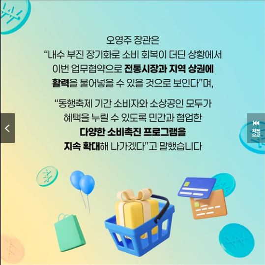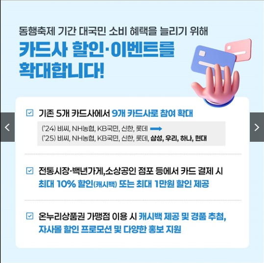 카드사 할인, 온누리상품권 이벤트, 특화 카드 출시 등 소비자들이 실질적인 혜택을 체감할 수 있도록 다방면에서 지원이 이루어질 예정입니다.