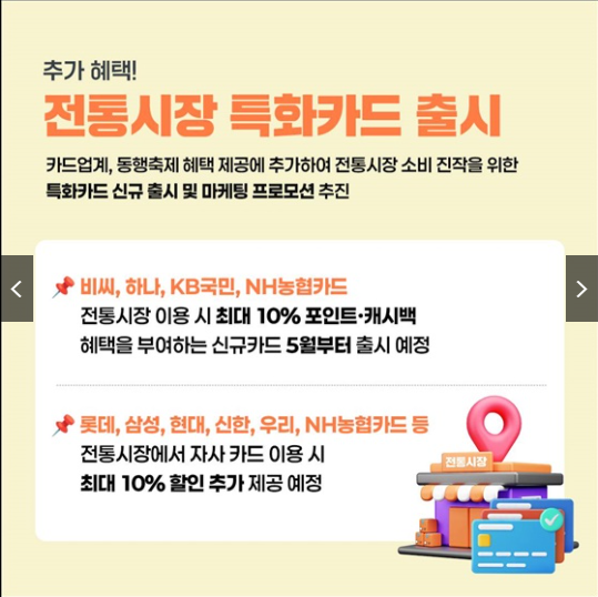 특히 기존보다 참여 카드사가 늘어나면서 할인 혜택이 더욱 확대되었으며, 전통시장 특화카드 출시로 지속적인 소비 활성화도 기대됩니다.