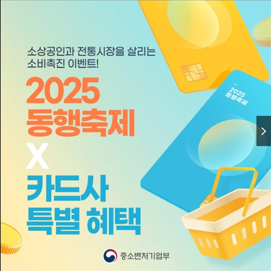 2025 동행축제는 소상공인과 전통시장의 매출 증가를 지원하는 대규모 소비촉진 행사입니다. 카드사와 협력하여 소비자들에게 강력한 할인 혜택과 캐시백을 제공하면서, 전통시장과 지역 상권 활성화를 목표로 하고 있습니다.