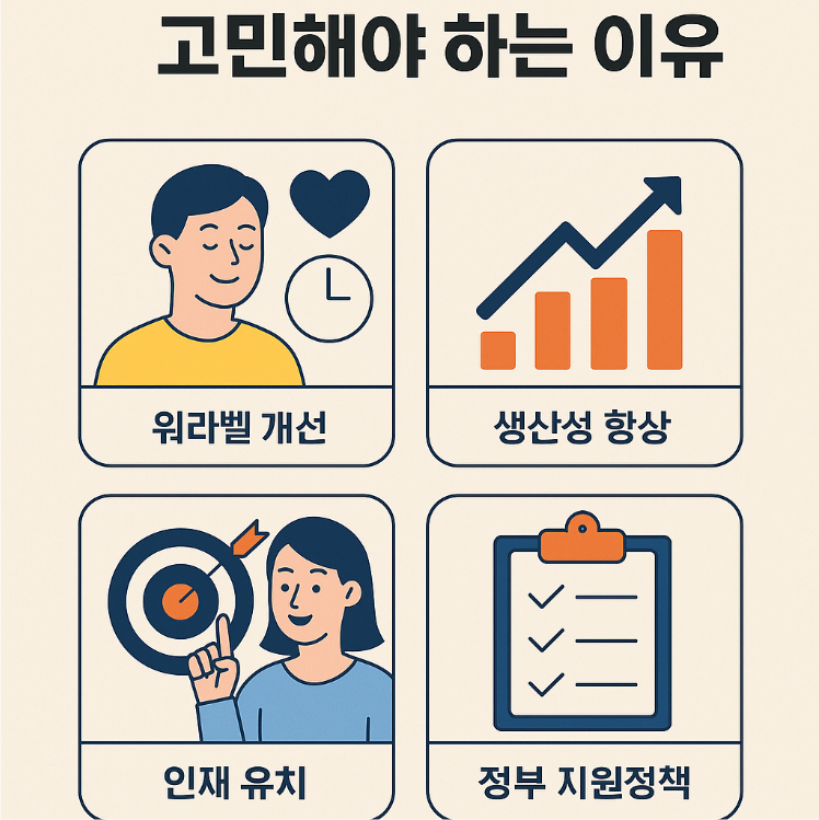 기업의 업종, 규모, 업무 특성에 따라 주 4일제 도입 방식이 달라질 수 있습니다. 따라서 각 기업은 자사의 상황에 맞는 유연한 근무제도를 설계하고, 시범 운영을 통해 효과를 검증한 후 본격 도입하는 전략이 필요합니다.
