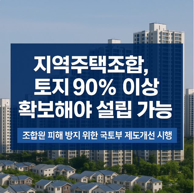 「지역주택조합 사업의 안전성과 투명성을 강화하기 위해 국토교통부가 신규 조합 설립 및 조합원 모집 단계에 대한 제도개선을 추진합니다. 앞으로 조합원이 모집되기 전에 토지매매계약서의 90% 이상 확보 등 실질적 토지확보 요건을 충족해야 하며, 사업계획의 명확성을 높이기 위해 용도지역·용적률 변경이 완료된 경우에만 신고 수리를 허용하는 등 사업 리스크를 대폭 낮추는 방안이 적용됩니다. 지역주택조합에 관심 있는 조합원과 예비 조합원 모두가 알아야 할 핵심 제도 개선 내용을 정리했습니다.」