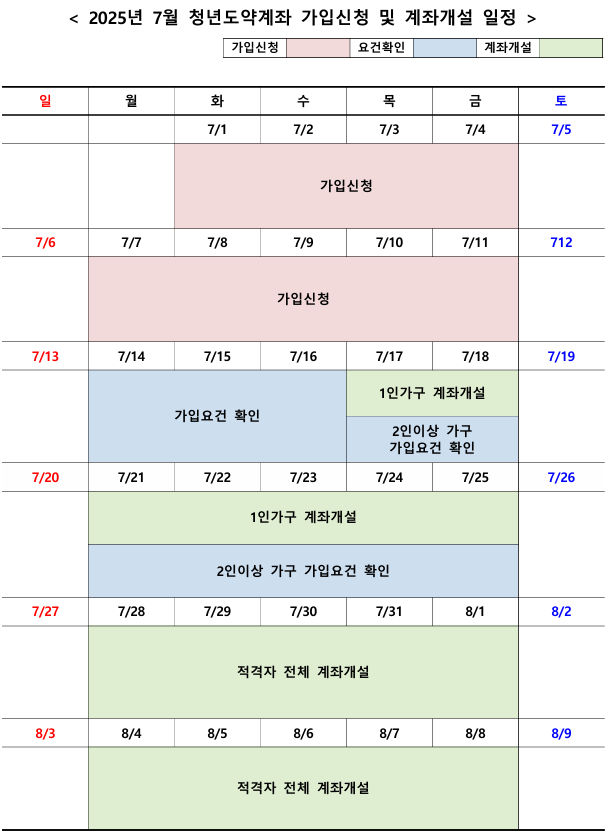 서민금융진흥원(서금원)에 따르면, 2025년 7월 청년도약계좌 신규 가입 신청 기간은 7월 1일(월)부터 7월 11일(목)까지 총 9영업일간 운영됩니다.