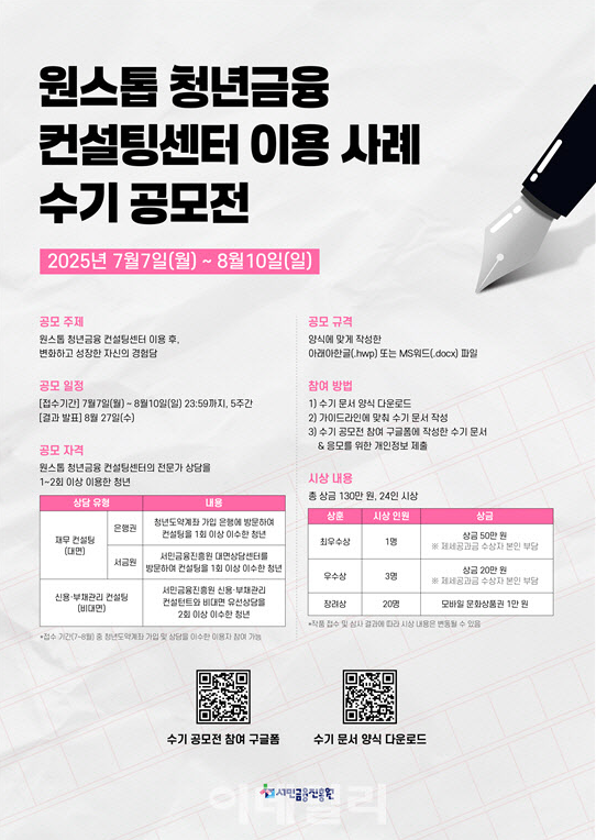서민금융진흥원은 청년도약계좌 가입자 및 청년 금융상담 이용자를 대상으로 **‘원스톱 청년 금융 컨설팅센터 이용 수기 공모전’**도 개최합니다.