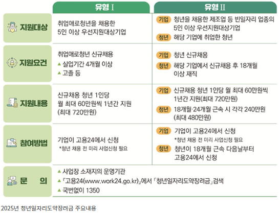또한, 청년일자리도약장려금을 통해 청년들이 장기 근속할 수 있도록 장려금을 지급합니다. 유형1은 취업애로청년을 고용한 기업에게 최대 720만 원의 장려금을 지원하며, 유형2는 빈 일자리 업종에 취업한 청년들에게 18개월, 24개월 근속 시 각각 240만 원씩 최대 480만 원을 지급하여 청년들의 경제적 안정과 근속 의지를 높입니다.