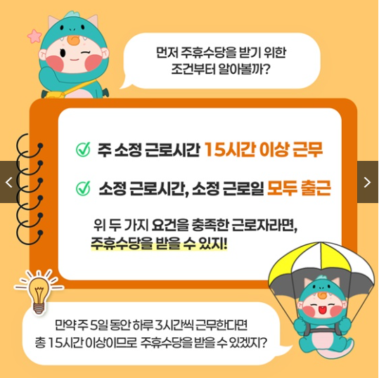 - 월요일부터 금요일까지 하루 3시간씩(총 15시간) 근무한 경우 → 주휴수당 지급 대상