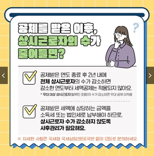 - 공제받은 연도 종료 후 2년 내에 상시근로자 수가 줄어들면 세액공제 중단
