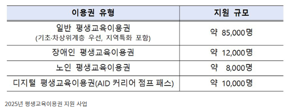 2025년에는 지원 대상이 확대되어 저소득층 성인(19세 이상 기초생활수급자·차상위계층), 등록장애인(19세 이상), 노인(65세 이상), 디지털 관련 평생교육 수강 희망자(30세 이상) 등으로 구성됩니다. 이를 통해 약 11만 5,000명이 혜택을 받을 수 있으며, 총 예산은 362억 원에 달합니다 .