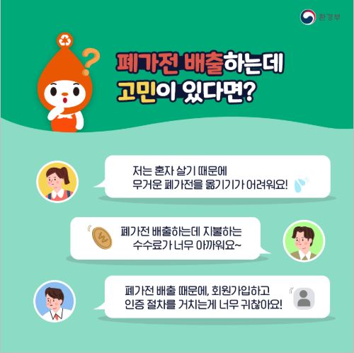 가전제품을 오래 사용하다 보면 고장이 나거나 더 이상 사용하지 않게 되는 경우가 생깁니다. 하지만 폐가전을 버리는 방법을 몰라 애물단지처럼 방치하는 경우가 많습니다. 이에 따라 환경부, 한국환경공단, 지자체 및 가전제품 제작·판매사는 협력하여 폐가전 제품을 무료로 수거하는 서비스를 운영하고 있습니다.