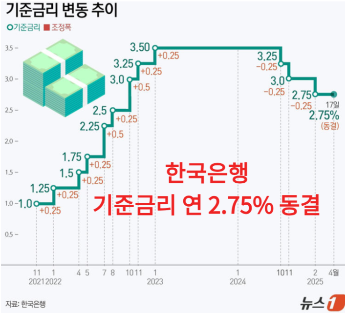 2025년 4월 17일, 한국은행 금융통화위원회는 기준금리를 연 2.75%로 동결하기로 결정했습니다. 이는 2월 금리 인하 이후 연속적인 동결 조치로, 국내외 경제 여건과 금융시장 불확실성을 고려한 신중한 판단으로 해석됩니다.