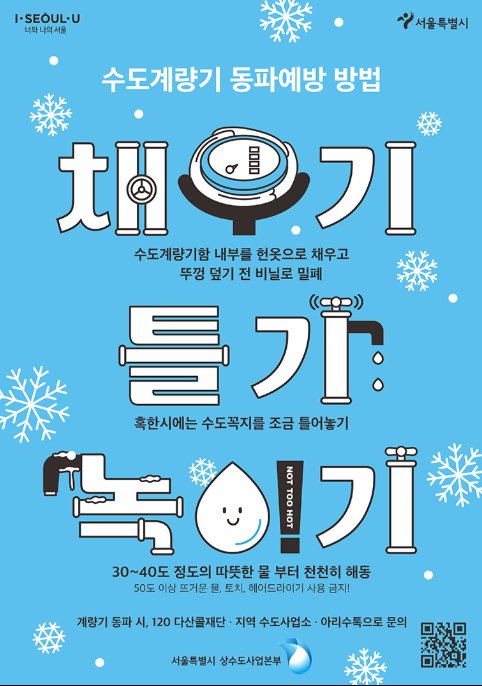 우선 장기간 집을 비울 예정이라면 수도 메인 밸브를 잠그는 것을 고려해볼 수 있습니다. 다만 이 경우에도 배관 안에 남아 있는 물이 얼 수 있기 때문에, 밸브를 잠그기 전에 모든 수도를 한 번 열어 물을 최대한 빼주는 것이 좋습니다. 이후 계량기와 배관 보온 상태를 다시 한번 점검해 주세요.